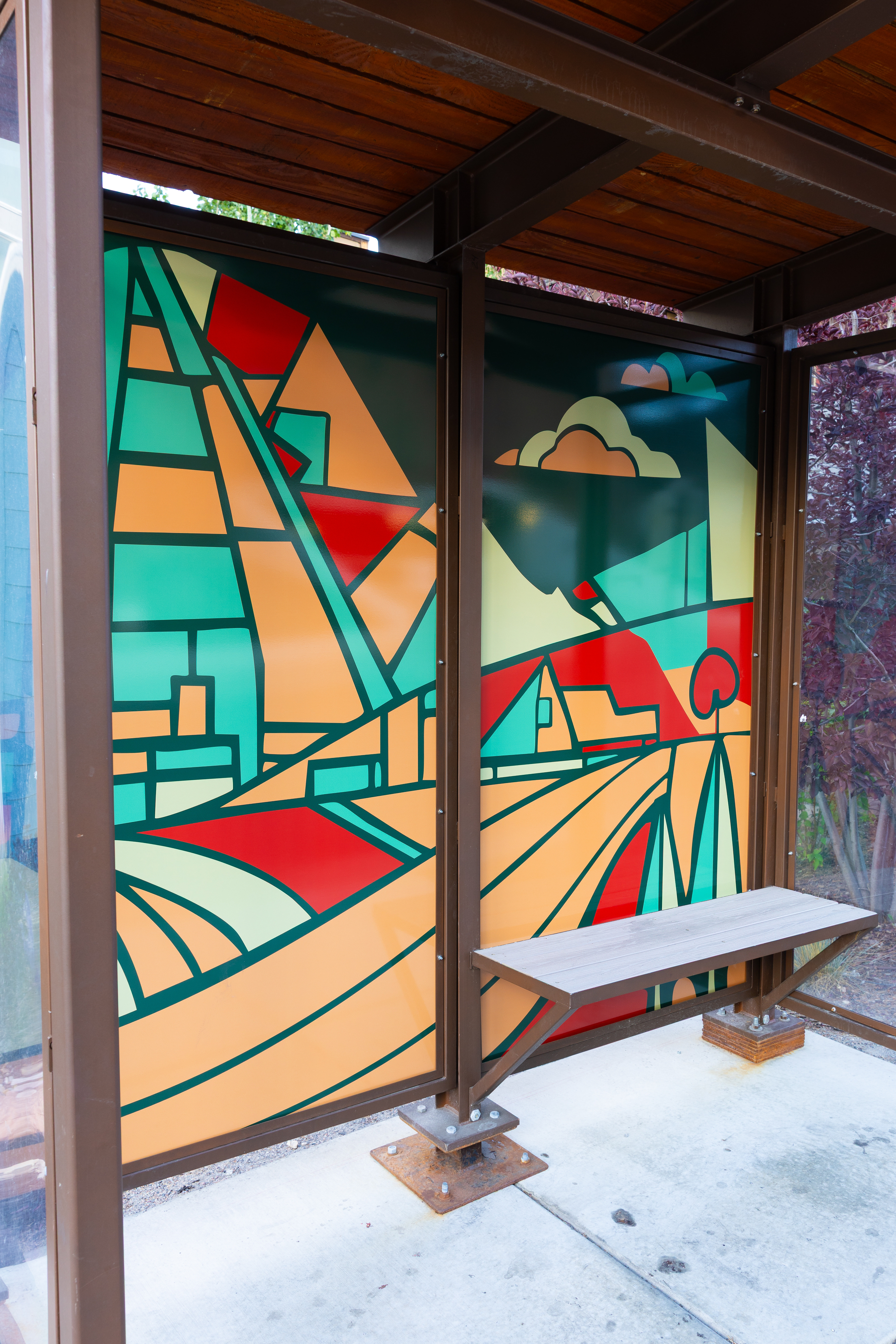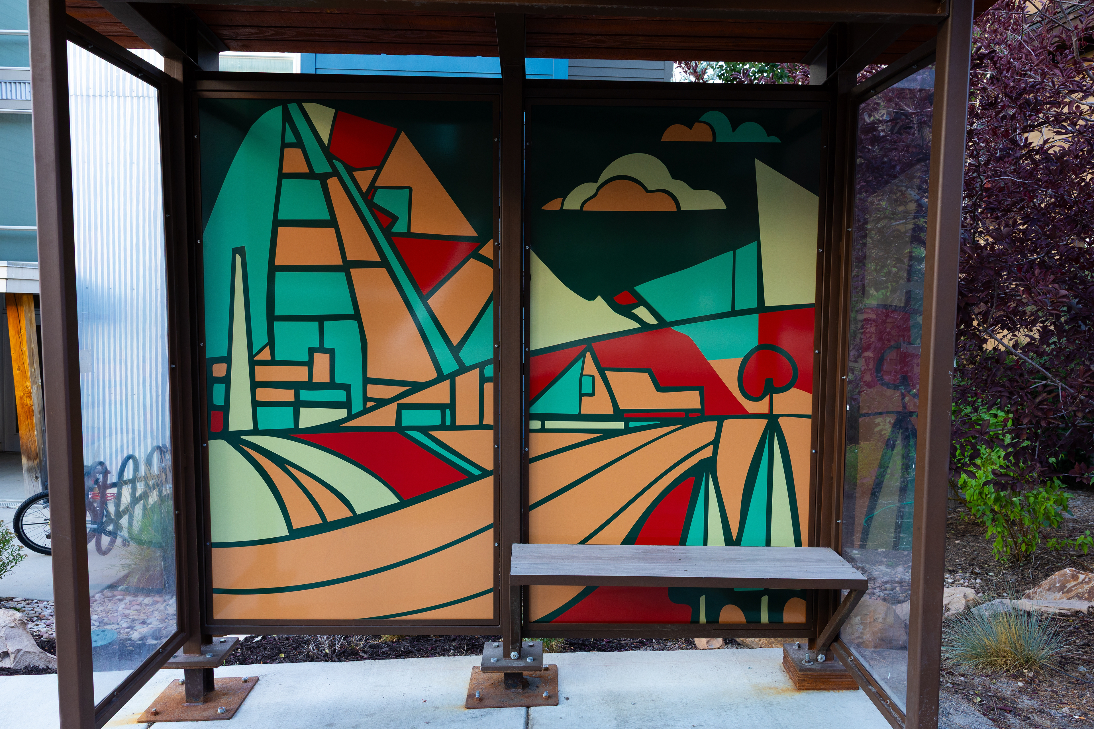 Designed 4’6 x 10 ‘ site-specific public artwork for Park City's “Timeless Connections” bus shelter project, incorporating local cultural themes and a transit-inspired color palette. Managed fabrication and installation process, including material selection (UV-laminated print on 0.063" aluminum) and coordination with installers to ensure durability and compliance with city requirements
