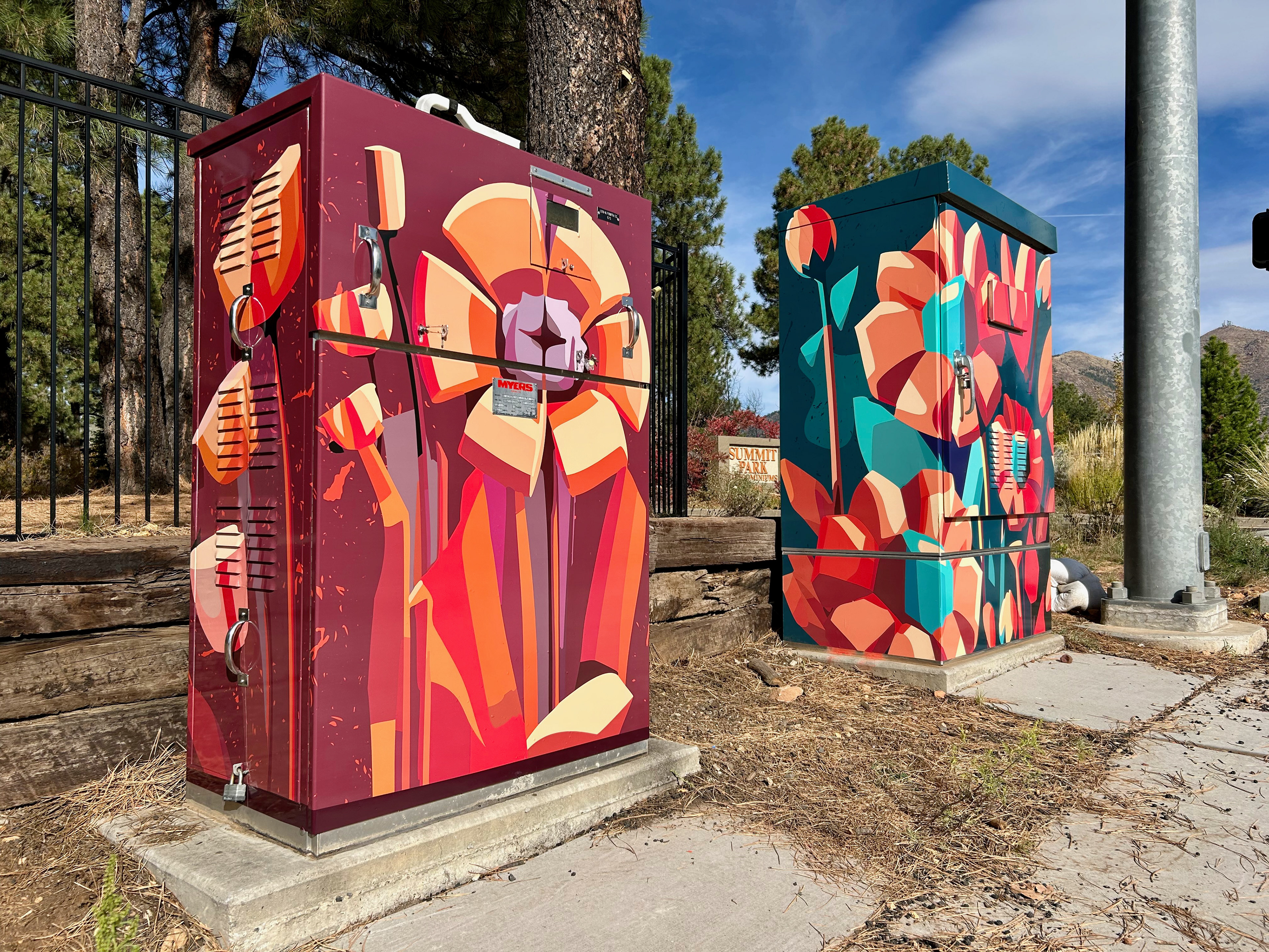 Created two custom designs for the City of Flagstaff, AZ Traffic Cabinet Project (2024) Partnered with a local vendor for the installation. These are located at Fourth Street and E. Sparrow Avenue. Dimensions are Blue Cabinet: 71" H x 46" L x 28" W. Magenta Cabinet: 54" H x 36" L x 20" W